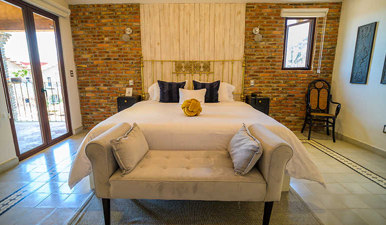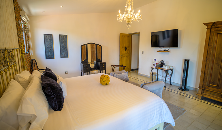 Amplia y confortable suite para 2 personas con cama King Size, baño completo, closet y amplia terraza, ideal para tener una escapada romántica en pareja, mientras disfrutas del máximo confort en instalaciones que asemejan la vida en la Toscana.