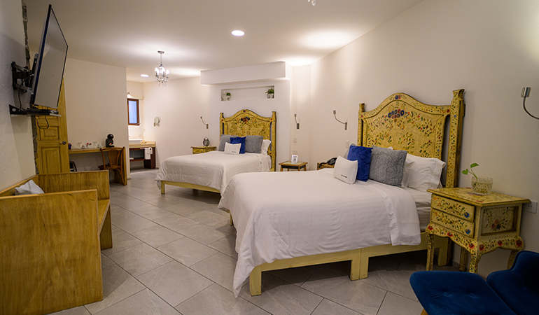 Muy espaciosa y cómoda suite de 62 mts2 en planta baja con amplia terraza para 1 a 4 personas con dos camas Queen Size, baño completo con espejo de vanidad, closet y escritorio. Tendrás una estancia única disfrutando una velada en su terraza con vista al acceso principal de Val’Quirico y lotes residenciales en “Bosques”. Accesible para personas con capacidad diferentes.